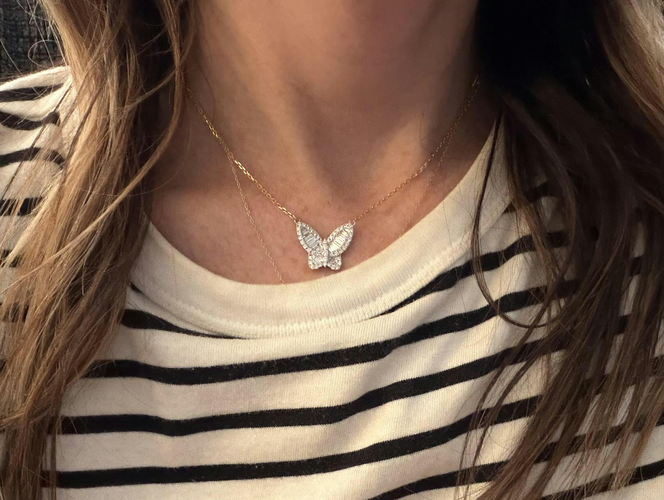 The Extra Large Diamond Butterfly Necklace is such a beautiful piece from Nicole Rose! It is substantial enough to wear on its own and look amazing, and yet it is not too large to layer with your other necklaces. I preferred it to the Large Diamond Butterfly Necklace because I'm 5'6" and have broad shoulders. And they make Small and Medium diamond butterfly necklaces that look adorable to wear with the Large and Extra Large butterfly necklaces. You will not go wrong with this beautiful baguette diamond butterfly necklace by Nicole Rose in any size!