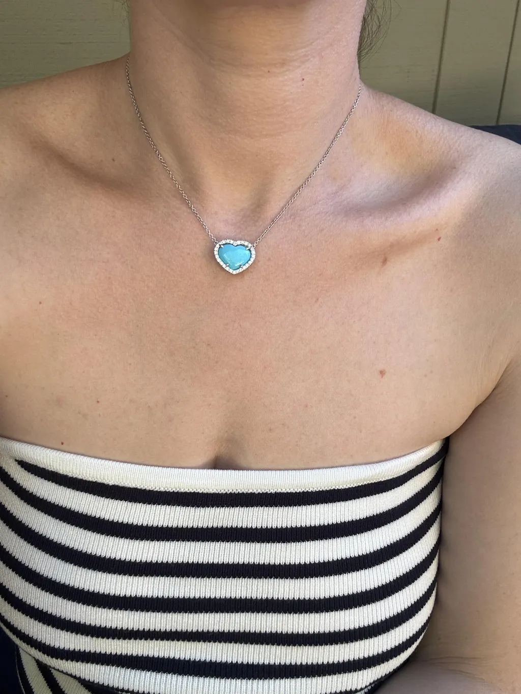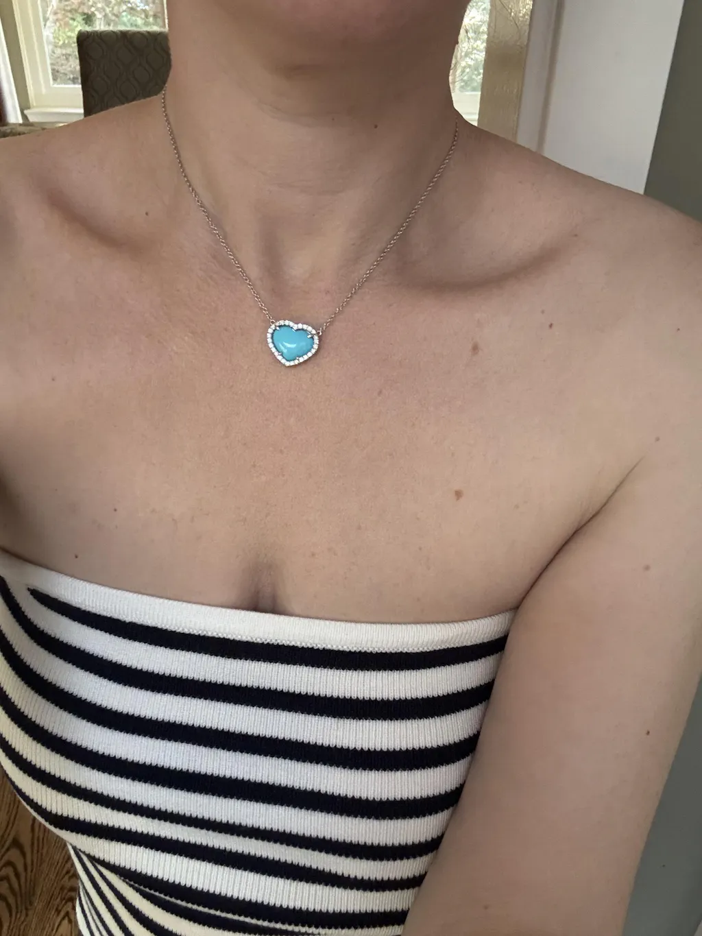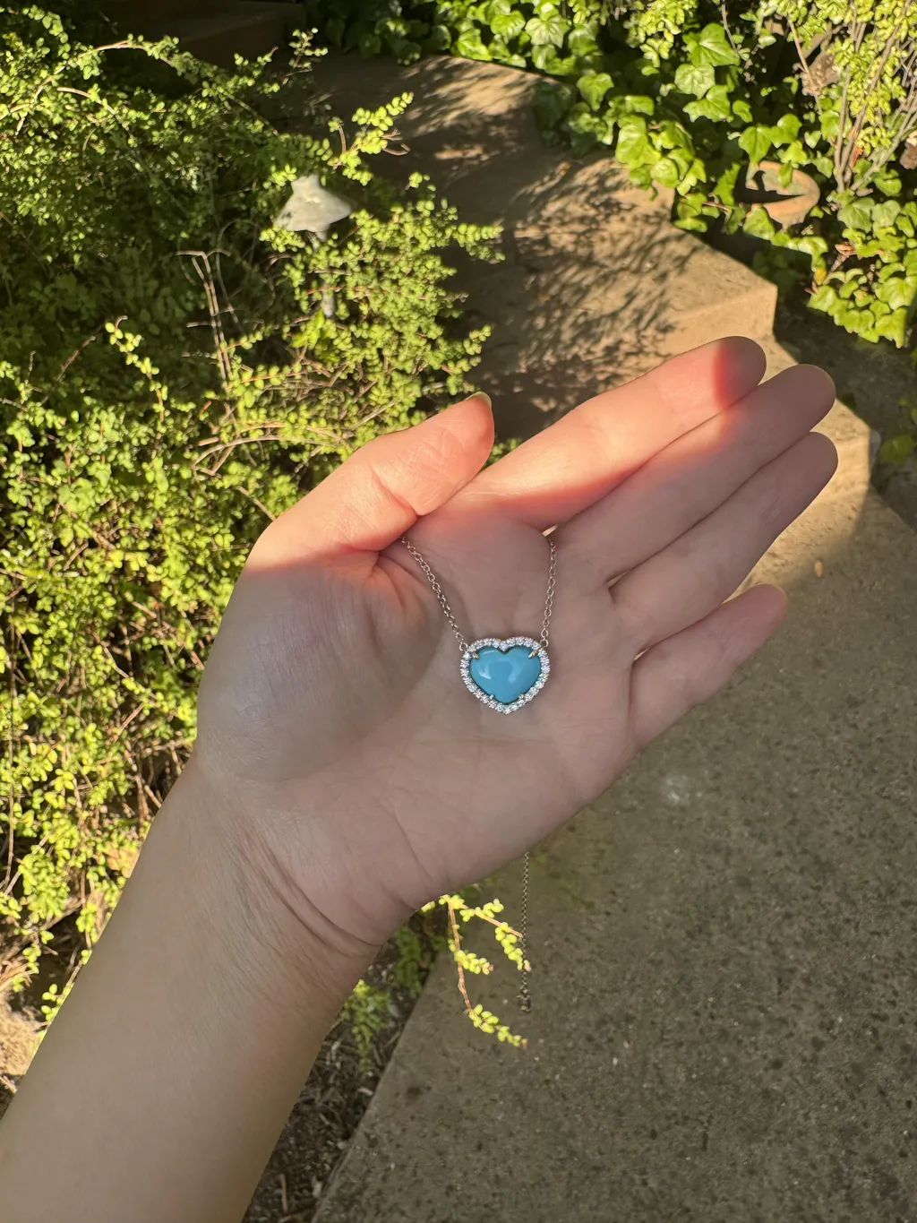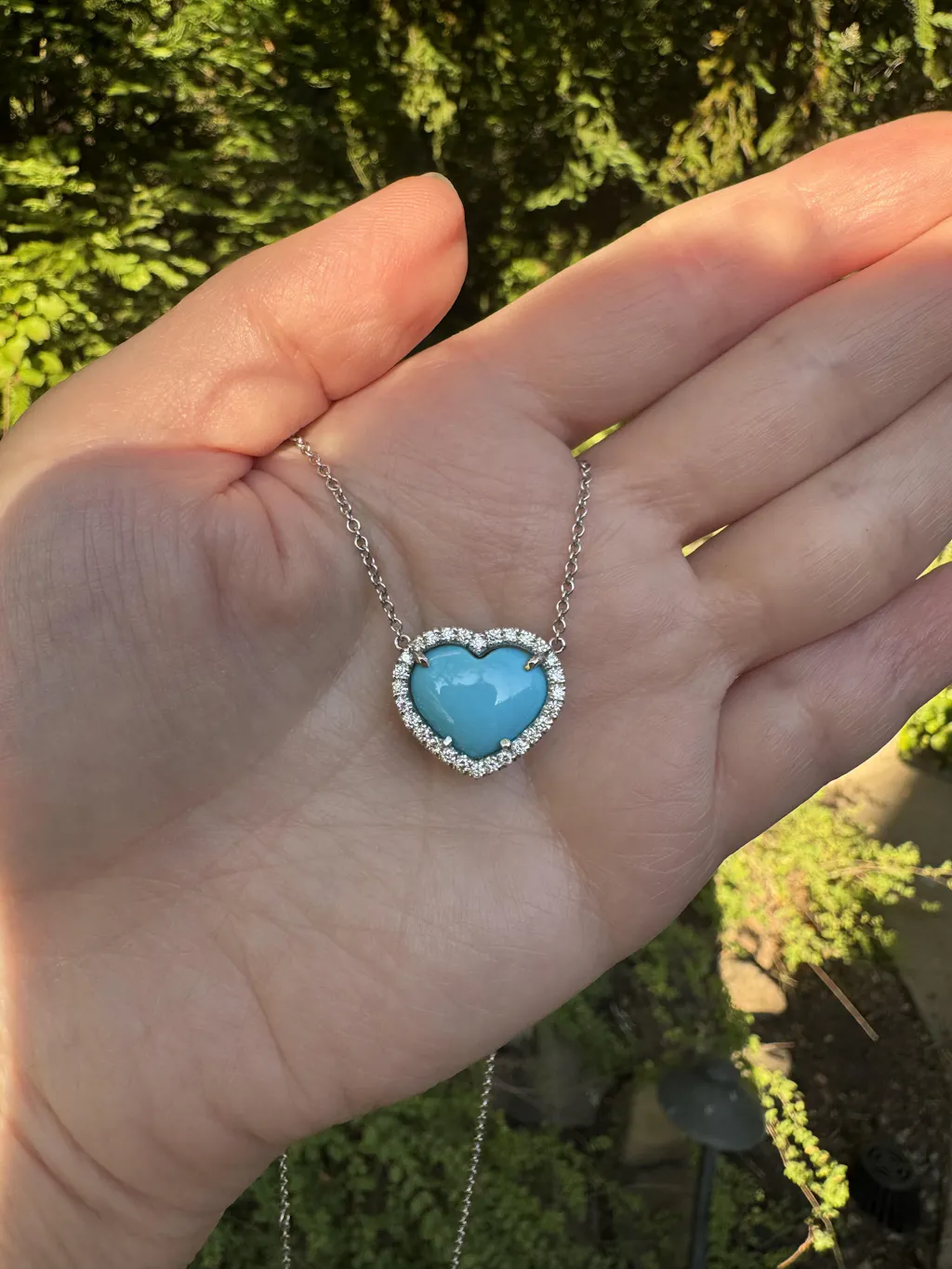 The turquoise heart necklace is absolutely stunning! The most beautiful color turquoise that just pops. Has a very nice weight to it and the diamonds are so sparkly and big. It’s a very high quality piece and I love that it’s a natural turquoise. I absolutely love it!!! Nicole Rose jewelry is truly the most beautiful and the customer service is absolutely the best always!!!